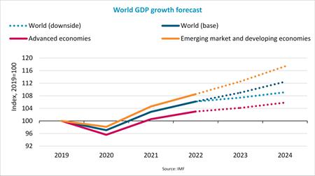 国际货币基金组织(IMF)预计2022年的全球经济增长率为3.2%,而对2023年和2024年的预测各下调至2.7%和3.2%,且2023年增长率低于2%的可能性为25%。