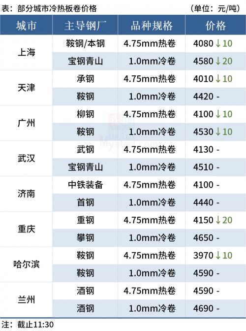 ◎上海:23日早盘上海热轧价格跌10,现主流报价1500普4060-4080元/吨,1800普4240-4260元/吨;1500锰4270元/吨,1800报4390元/吨左右,2.75Q235B报4120-4140元/吨,2.75SPHC报4160元/吨左右。(元/吨)