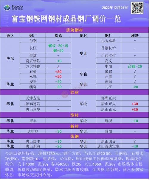 3、华尔街日报:美国房贷利率呈下降趋势,但本周涨跌不一,30年期固定利率房贷的平均利率小幅下降,但15年期的平均利率则上升。截至12月22日,30年期固定利率房贷的平均利率从上周的6.31%下降至6.27%。一年前该平均利率为3.05%。三、钢市动态【建-材市场周末成交】今唐山钢坯持稳,现报3730元。钢厂方面,马长江跌20-50,马钢稳,石横永锋稳,南钢跌10,高义稳,立恒稳,唐山线螺主流偏弱20调整,现高线含税价:安丰4000,跌20;春兴4050,跌20;九江4060,跌20;市场整体主稳弱调,价格波动幅度收窄,周末市场需求较弱,全国疫-情影响,商户多居家休息,市场成交氛围冷清。
