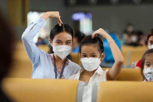 2022年4月24日,在老挝琅勃拉邦,中老铁路员工与小乘客合影。新华社发(杨永全摄)