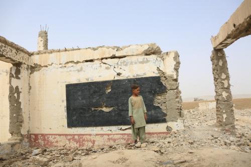 2022年8月23日,在曾多次遭到美军空袭的阿富汗南部赫尔曼德省桑金地区,一名男孩站在废墟之中。新华社发(塞夫拉赫曼·萨菲摄)