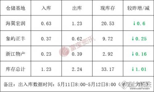 唐山钢坯库存总计33.17万吨,较昨减少1.01万吨,其中:海翼宏润昨入库0.63出库1.23,现库存20.53万吨;象屿正丰昨入库0.37出库0.62,现库存9.72万吨;物产震翔昨入库0.23出库0.39,现库存2.92万吨。