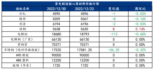 截止2022年12月30日,各原材料当日即时价格以及价格周环比情况如下: