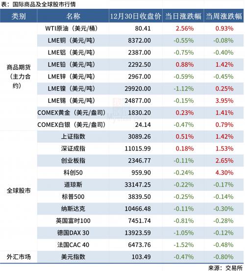 ◎ 12月30日,全国主港铁矿石成交115.30万吨,环比增5.3%;237家主流贸易商建材成交10.60万吨,环比增9.6%。