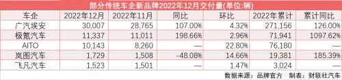 同日,AITO问界也公布了12月成绩单,12月交付量为10,143辆,环比增长22.8%,再次实现单月交付破万。自3月启动正式交付以来,AITO问界已经实现累计交付7.62万辆。“面对2022年疫情影响、高温限电等各类难题,AITO问界能取得这样的成绩属实不易。”有AITO问界内部人士向财联社记者表示。