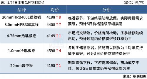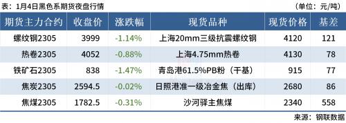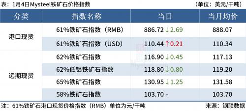 ◎1月4日,全国主港铁矿石成交137.00万吨,环比增8.6%;237家主流贸易商建材成交9.29万吨,环比减17.8%。