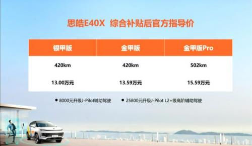 江汽集团官微消息,5月16日,新一代智能纯电SUV思皓E40X正式上市,补贴后的官方指导价为13万-15.59万元。即刻起前往官方线上订车可享价值3万元的购新礼包:首任非营运用户可享受三电终身质保、终身免费车联网基础流量以及免费充电桩安装权益,另外还赠送10000元DIY炫改抵用券、4000元原厂精品、2000元智能车载电站、3000元智能充电桩以及至高9000元金融贴息。