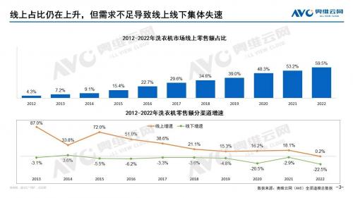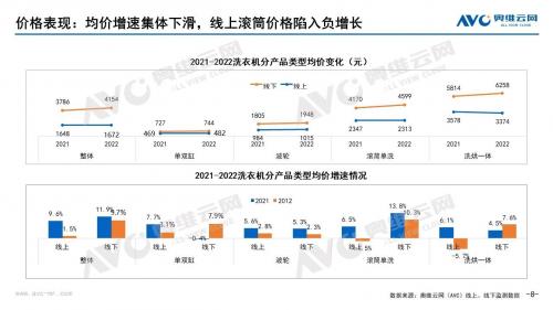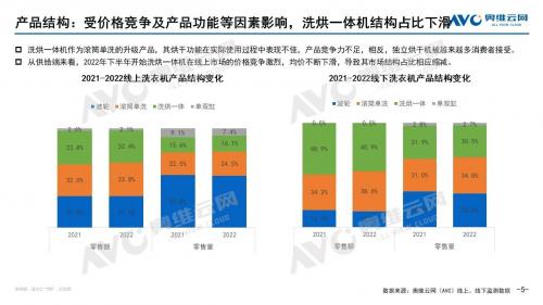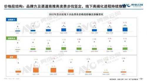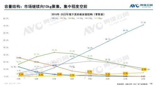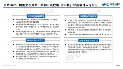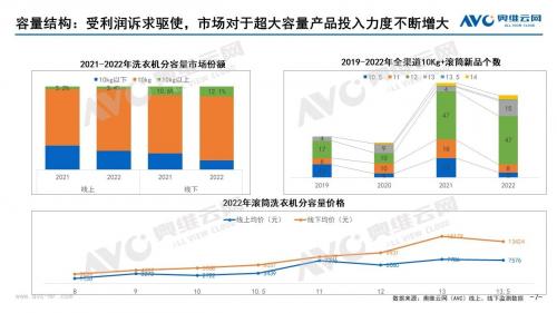 回顾2022年,在规模及经营压力下,企业从价格策略,渠道转型,以及技术迭代上都做出了诸多探索。就价格策略而言,线上洗烘一体机持续降价,一度使得低端洗烘一体机价格逼近成本边缘。就渠道策略而言,线上流量红利耗尽,线下KA渠道萎缩的大背景下,企业端对于下沉及拼抖快市场的持续投入,对于商超及区域连锁的重视程度增大,就产品策略而言,内资品牌集中上新分区洗衣机,提升产品结构。外资品牌加速布局超大容量,追赶内资品牌的步伐。