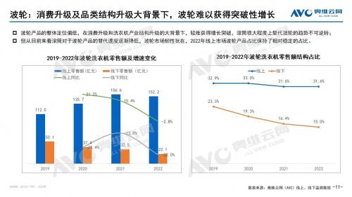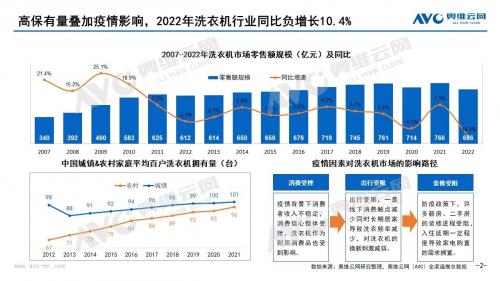 展望2023年,考虑到外部环境逐步转好,消费需求将出现复苏,洗衣机市场积压的需求将得到释放。此外,22年同期规模低基数下,23年增长的压力较小。因此根据奥维云网(AVC)预测数据,2023年洗衣机市场预计实现恢复性增长,零售额737亿元,同比增长7.4%,零售量3628万台,同比增长7.6%。