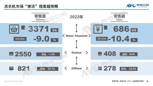 过去一年,在外部环境错综复杂,国内疫情持续反复,消费信心持续低迷诸多因素影响下,洗衣机市场发展不及预期,规模增长遭遇冰点。奥维云网(AVC)推总数据显示,2022年洗衣机规模是自2016年以来首次跌破700亿大关。洗衣机市场全渠道零售额规模为686亿元,同比下滑10.4%,零售量为3371万台,同比下滑9.0%。