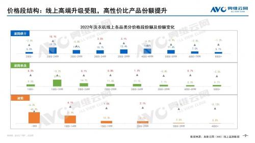 2022年的用户需求特点明显,核心聚焦“洗涤”本源,对于高附加值的产品购买热度较低。线上市场用户对于价格敏感度更高,根据奥维云网(AVC)线上监测数据,线上滚筒单洗零售量占比达到24.5%,份额同比增长2.0%。对比之下,洗烘一体机零售量份额为16.1%,同比增长0.5%。从价格段表现来看,线上消费者的选购出现了明显的消费降级趋势,中高端市场份额呈现不同程度的下滑,中低端产品更受消费者青睐。