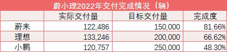 与此同时,“蔚小理”也未能完成年初既定的销量KPI。其中,蔚来汽车完成度为81.66%、理想汽车66.62%,而小鹏汽车的完成度尚不足一半。