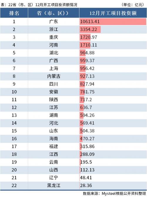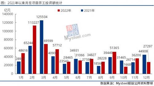 据Mysteel不完全统计,2022年12月,全国各地共开工4019个项目,环比下降19.8%;总投资额约27296.8亿元,环比下降24.6%,同比下降39.2%。