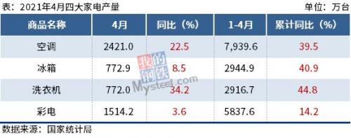 国家统计局数据显示,2021年4月,我国空调产量2421.0万台,同比增长22.5%;1-4月累计产量7939.6万台,同比增长39.5%。