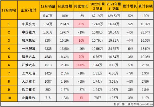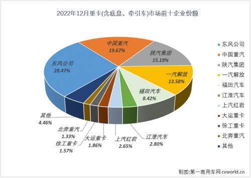 上表可见,2022年12月份重卡市场同比下降6%,同比降幅较上月(-9%)缩窄3个百分点,约比2021年12月份少销售3500辆,约相当于2021年12月份销量的94%。12月份,重卡市场有两家企业销量破万辆,东风和重汽12月份分别销售各类重卡1.54万辆和1.06万辆,月度份额分别达到28.47%和19.67%;陕汽和解放分列3、4位,12月份分别销售8204辆和7335辆,月度份额分别为15.19%和13.58%;福田月榜第5位,12月份销售各类重卡4548辆,月度份额为8.42%。2022年12月份,销量前十企业合计份额达到95.54%,其中排名前五企业合计份额达到85.33%,行业TOP5企业12月份合计份额较上月(84.95%)有所扩大,继续以较大优势领跑。