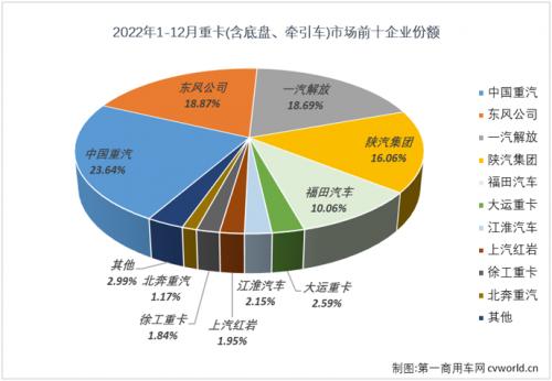与2021年全年重卡行业格局相比,排名行业第4、5位的陕汽和福田,排名行业第7位的江淮,以及排名行业第9位的徐工等4家企业行业排名保持不变。变化如下:北奔进入行业前十(2021年北奔排名第11位),重汽上升一位最终“登顶”,东风上升一位至行业第2,大运则从2021年的行业第8上升2位至行业第6,进步最为明显。与此同时,也有企业被挤出了2022年重卡行业前十。
