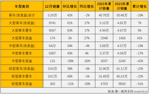 上表可见,客车(含底盘)市场12月份同比下降2%,细分市场表现为大客市场增幅缩窄,中客市场再次转负,轻客市场降幅缩窄。其中,大型客车(含底盘)市场同比增长17%,同比增幅较上月(+47%)缩窄30个百分点,大客市场收获了2022年的第8次增长,值得一提的是,大客市场累计销量增幅在10月过后成功转正,全年累计销量增幅达到7%,大客市场成为2022年客车市场,乃至整个商用车市场唯一实现增长的细分市场;中型客车(含底盘)市场同比下降4%,同比增幅从上月(-11%)遭遇转负,中客市场2022年全年累计销量同比下降了19%;轻型客车(含底盘)市场同比下降6%,降幅较上月(-17%)缩窄11个百分点,2022年全年,轻客市场累计销量降幅达到22%,是客车市场中下滑最严重的细分市场。