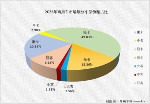2022年全年,我国商用车市场累计销售330.05万辆,同比下降31%,比2021年全年少销售接近150万辆。具体到细分车型看,2022年全年,卡车市场中的轻卡占比最高,约占了商用车市场接近一半的份额(49.03%),重卡、中卡和微卡分别占20.36%、2.9%和15.36%;客车市场大、中、轻客分别占2022年商用车市场1.56%、1.11%和9.68%的份额,客车在2022年商用车市场合计份额仅有12.36%。