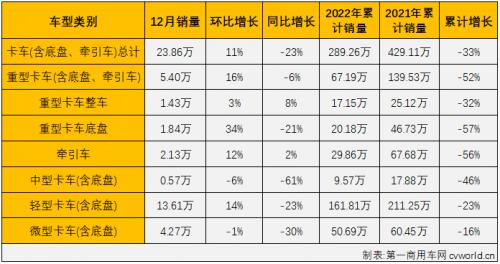 由上表可见,环比11月份,12月份卡车市场四大细分市场增减各半,中卡和微卡市场环比出现下滑;与2021年同期相比,卡车市场的四个细分市场则是继续全数出现下滑,其中重卡市场整体来看12月份降幅较11月份有所缩窄(11月份重卡市场销量同比下降9%),其中牵引车和重卡整车市场则实现增长;中卡市场同比降幅较11月(-54%)有所扩大;轻卡市场同比降幅与11月持平;微卡市场同比降幅较11月份(-38%)有所缩窄。12月份,卡车市场遭遇了2022年的第8次“全军覆没”。