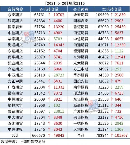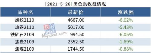 截至5月26日收盘,螺纹2110收4667,跌6.02%;热卷2110收5017,跌5.43%;铁矿石2109收994.5,跌6.05%。