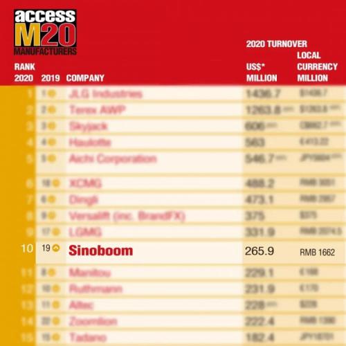 5月27日,由英国KHL集团旗下《Access International》(世界知名高空作业平台杂志)发布了“2020 ACCESSM20榜单”(2020年全球高空作业平台制造企业20强),星邦智能较2019年上升9个名次,一举跃升至第十位,是提升幅度最大的品牌之一,表现抢眼,增幅超其他品牌。