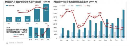12月新能源汽车动力电池装机量较上月增加12.1GWh。2022年12月,新能源汽车动力电池装机量40.2GWh,同比增长50.6%。2022年累计装机量261.8GWh,同比增长84.3%。12月疫情的影响有所减退,但群体性感染让终端市场在一段时间内陷入萧条,市场销量基本在下半月才得以释放。在年底终端促销外加新能源补贴即将退出的双重刺激下,装机量在12月依然实现了大幅上升。
