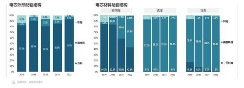 从外形上看,方形电池在国内市场地位依然稳固,2022年方形电池占据93.2%的市场份额。软包、圆柱形电池的市场呼声逐渐提高,但从销量份额上仍未见起色。从材料方面来看,磷酸铁锂电池在短期内依然保持快速增长,2022年市场份额超越三元达到55.6%。电芯材料价格在2022年年尾又出现一定幅度的上涨,低成本电池的市场优势进一步增强。