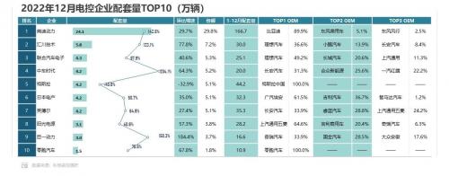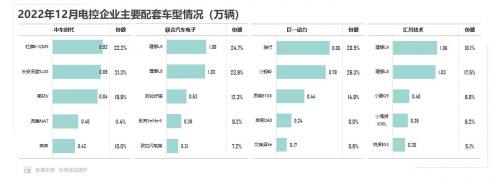 12月,Top10电控配套企业合计占比72.2%,行业集中度环比下降4.5%,市场格局维稳。中车配套企业较为多元,在乘用车、卡车、客车均有电控配套实践。一汽和长安的年底增长,拉动中车配套量实现大幅上升。