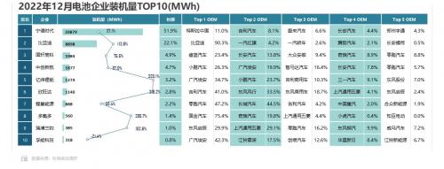 12月市场整体装机量有所上浮,多数企业跟随市场趋势实现增长。宁德时代装机量达到20.9GWh,占据市场份额51.9%,其中特斯拉贡献11%的配套份额。2022年全年电芯配套市场集中度依然较高,但去除比亚迪自身销量拉动影响,Top5企业(排除比亚迪)份额相比去年下降了2.6%。腰部企业成为补充市场活力,激发企业创新的关键力量。