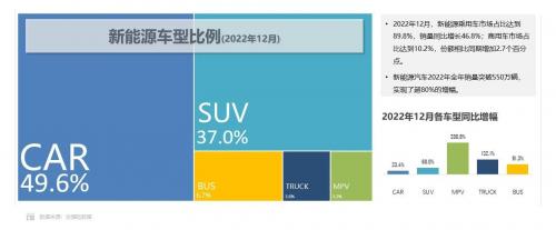 2022年12月,轿车占比49.6%,比去年同期低6.6个百分点;SUV、MPV提高2个百分点;客车份额微降0.6个百分点,卡车则微增0.2个百分点。