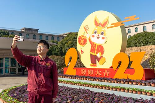 春节即将到来,为确保沙钢干部员工特别是留在江苏张家港过年的职工度过一个欢乐、祥和的春节,沙钢精心策划系列暖心活动,营造出韵味十足的节日氛围。图为沙钢职工与厂区里的兔年春节主题景观合影。 (丁超摄)