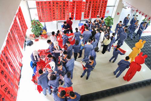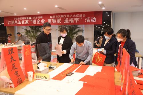 1月12日,中信泰富特钢集团(兴澄特钢)联合江阴市沈鹏文化艺术促进会,组织江阴市部分书法名家和兴澄特钢书法爱好者举行“进企业写春联送福字”活动,迎接即将到来的兔年新春。(特约通讯员陆卫宇摄)