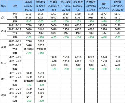 本周广东主导钢厂出厂价格全部下跌,目前韶钢三级螺纹钢出厂指导价格5640元/吨、线材5960元/吨、盘螺5930元/吨、中板6630元/吨;珠海粤钢三级螺纹钢出厂指导价格5120元/吨、线材5330元/吨、盘螺5350元/吨。