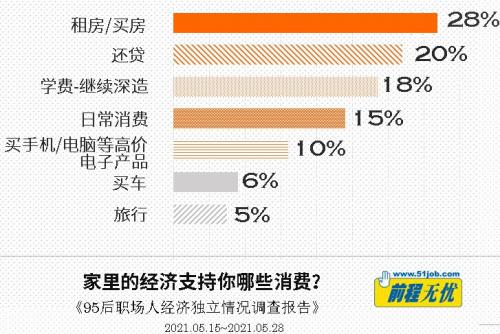 调查显示,95后职场人的开销不小,绝大多数人不需要补贴家里,相反仍定期或不定期地获得家人的资助。依靠父母经济支持的95后职场人,主要把父母给的钱用在了衣食住行的“住”上——用于租房/买房和还贷的开支,在收到的家庭经济支持中占比合计达48%。部分受访者表示,“即使月薪过万,如果每月有数千元的房租要交,或者按揭要还,那么就所剩不多。进入职场后的头两年,如果没有父母的资助,一般的衣食消费都无法自由”。另一些表示,“和父母约定,房钱我自己解决,但是水电费我父母出”。而表示“不拿家里钱”的95后职场人中,绝大多数也不要租房或者还贷。
