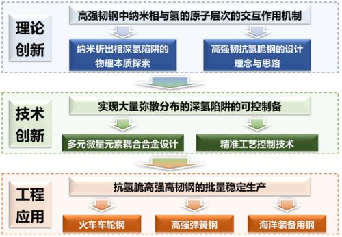 该项目的主要方案和技术路线如图1所示。其通过揭示高强韧钢中纳米相与氢的原子层次的交互作用机制,设计、制备不可逆晶内深氢陷阱,有效地抑制了高强钢的氢脆;在实际生产中,突破了多元微量元素耦合设计、精准工艺控制,实现了大量弥散分布的深氢陷阱可控制备;在产业化过程中通过控制多元微量合金的加入方式和钢液对流强度,实现了抗氢脆高强高韧钢的批量稳定生产。
