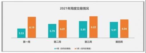 5月第四周日均交易量6.04万辆,环比上一周下降2.9%,与4月第四周相比增长2.1%。进入5月份后期,消费需求和进店集客都有所下降。回顾前三周交易情况五一长假后的第一周日均交易量6.19万辆,环比增长了4.88%,5月实现开门红,第二周小幅回落至6.01万辆,环比下降了3%,第三周还比增长了3.5%,可以看出本月前三周终端消费需求热情度较高,加上5.1期间各地车展置换出的大批车源在市场中流通,给本月持续向上的增长趋势提供保障。