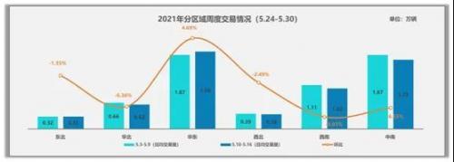 从各区域的交易情况来看,与上一周相比本周依然是华东地区呈增长趋势,其它各地均出现不同程度的下降。华北、中南地区降速超5%。