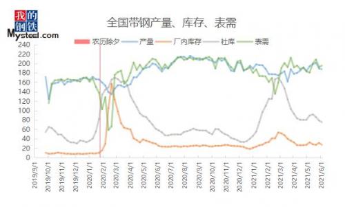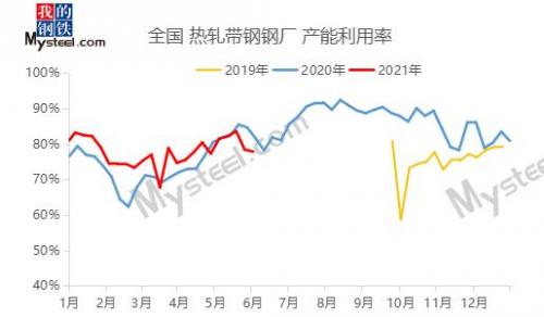 截止2021年5月26日,全国63家热轧带钢生产企业本周开工率76.29%,周环比+3.09%;月环比-2.06%;产能利用率为77.83%,周环比-0.57%;月环比-3.65%;本周钢厂实际产量为188.20万吨,周环比-1.39万吨;月环比-6.47万吨;钢厂厂内库存为27.15万吨,周环比-4.40万吨;月环比-5.49万吨。