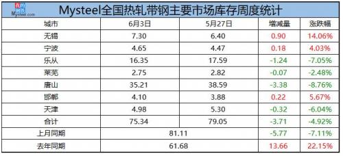 截至2021年6月4日,本周全国热轧带钢主要市场库存总量75.34万吨,较上周减3.71万吨,较上月同期降5.77万吨,较去年同期增13.66万吨。