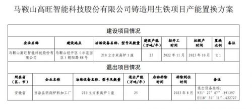 按照《国务院关于化解产能严重过剩矛盾的指导意见》《国务院关于钢铁行业化解过剩产能实现脱困发展的意见》《国务院关于印发打赢蓝天保卫战三年行动计划的通知》,以及《工业和信息化部办公厅发展改革委办公厅生态环境部办公厅关于重点区域严禁新增铸造产能的通知》要求,参照《钢铁行业产能置换实施办法》产能换算标准,现将马鞍山高旺智能科技股份有限公司210立方米铸造用生铁高炉项目产能置换方案公示如下,欢迎社会公众进行监督。