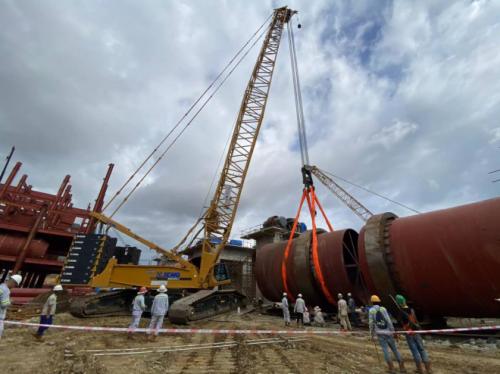 回转窑筒体分段离线组队同时,项目团队策划安全专项吊装方案,通过BIM技术对吊装站位、行走路线、吊装半径、焊接顺序及安全保护措施等全过程模拟、调整工艺、优化工序,最终提前10天完成吊装工作,同时Q245R材质回转窑筒体13道环缝射线一次探伤全部合格。