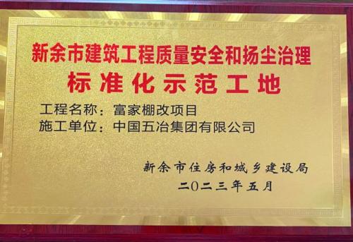 5月9日,新余市住房和城乡建设局组织召开“2023年度第一批建筑施工质量安全和扬尘治理标准化示范工地观摩会”。会上,中国五冶新余富家棚改项目被授予“新余市建筑工程质量安全和扬尘治理标准化示范工地”荣誉奖牌。