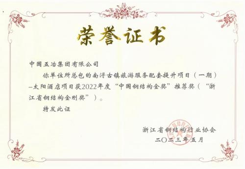 此次获奖是对中国五冶集团太阳酒店项目工程质量、技术创新、项目管理等的充分肯定,中国五冶集团将按照百分百高品质原则,高质量完成后续施工任务,为争创“中国钢结构金奖”和“中国建筑工程鲁班奖”打下基础。(曹永)