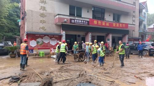 23日早上7点,项目部又集结动员61名突击队员、12辆应急车辆和1台铲车再次前往石板岭隧道清理道路淤泥和碎石。灾情面前,刚刚经历完深夜鏖战的救灾队员们仍是干劲十足,他们与风雨搏斗,与时间赛跑,经过七个多小时的连续作战,石板岭隧道口终于恢复道路畅通,当地群众的出行安全得到了保障。突击队员稍作休整,又再次转战富阳区大源镇勤功村,帮助当地村委会解决因强降雨造成的积水内涝问题,及时消除路面安全隐患。