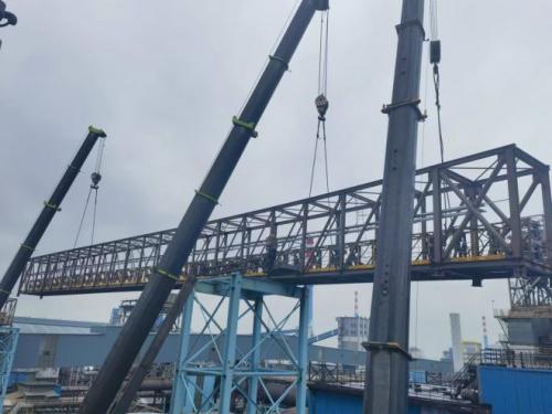 五高炉制粉输煤线项目整体布局在原有生产区域,施工作业面长、地下地上环境复杂,大部分区域涉及多个部门交叉管理。为保证该工程顺利进行,项目部会同业主、监理、相关兄弟单位等多方协作、紧密配合,多次召开现场会,明确作业时间和作业范围,在桩基施工、管带机立柱和桁架通廊施工等过程中,克服了设计变更多、现场焊接量大、交叉作业、作业面狭小、高温雨季等不利因素,在螺蛳壳里做道场,确保了各项节点目标按期完成。在大跨度通廊吊装过程中,项目团队面对吊装点位多而广、场地狭窄等困难,不断优化作业步骤,最终采用一台曲臂车、四台起重机进行空中换钩接力,分四个阶段顺利完成了大跨度通廊吊装作业,为实现管带机通廊全线贯通创造了有利条件。