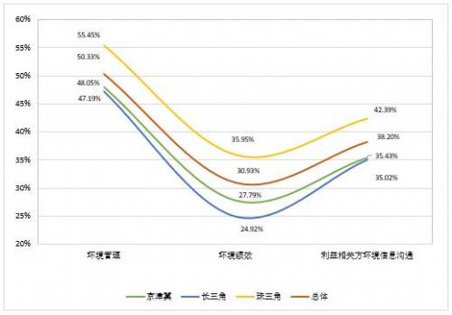 结果显示:与京津冀、长三角相比,珠三角企业披露水平最高,环境责任信息披露指数平均分为42.31,高于京津冀(34.51)和长三角(32.49)。从一级指标得分率来看,珠三角上市公司的一级指标得分率分别为55.45%、35.95%、42.39%,均高于京津冀和长三角。