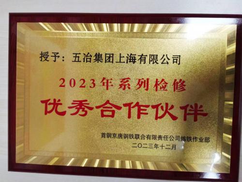 近日,首钢京唐钢铁联合有限责任公司授予中国五冶集团工程技术服务公司首钢京唐焦化作业部炼铁作业区“2023年系列检修优秀合作伙伴”称号。