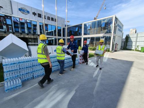 活动开始前,项目安全部门向各参建单位、作业班组宣贯了活动流程、人员分工、注意事项等具体工作。在高处坠落应急演练场景,针对作业人员不慎从高处摔落情况,应急小组迅速反应、立即警戒,医护人员对伤者进行检查并采取急救措施,随后第一时间转运至医院救治;在消防疏散应急演练场景,模拟10号楼2层木料发生火情,项目安全员巡视发现后立即报告应急指挥部并拉响火灾警铃,应急指挥部人员使用干粉灭火器开始灭火,楼栋内作业人员在统一指挥下用湿毛巾掩住口鼻有序撤离,应急水车再洒水确保彻底控制火情。随后,项目部为一线人员送上防暑降温物品,向他们坚守岗位的辛勤工作表示感谢。