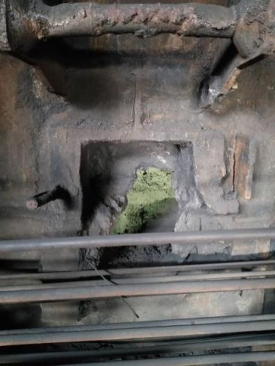 二是高炉短暂休风,割开铁口处封板,将铁口区砖衬或浇注料清除,里面露出红色渣铁。