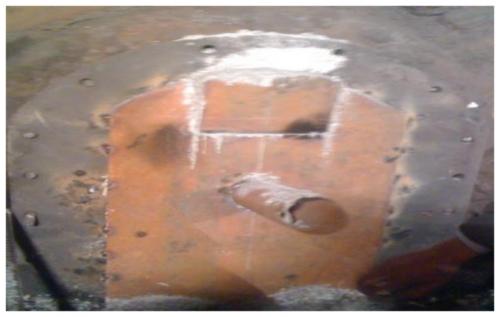 二是高炉短暂休风,割开铁口处封板,将铁口区砖衬或浇注料清除,里面露出红色渣铁。